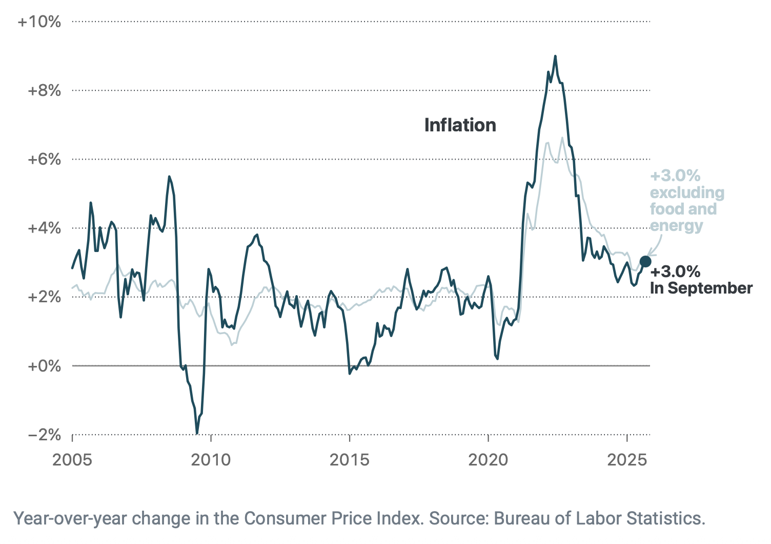 Every month, the New York Times puts out an updated version of this line plot along with an associated article detailing the latest U.S. inflation data from the Bureau of Labor Statistics.